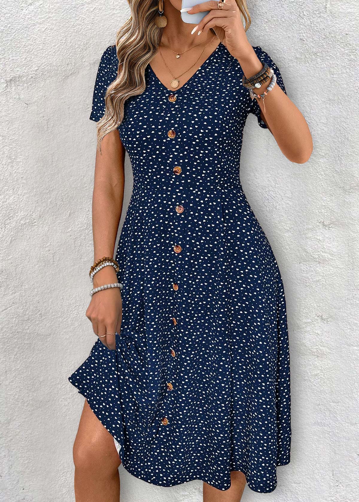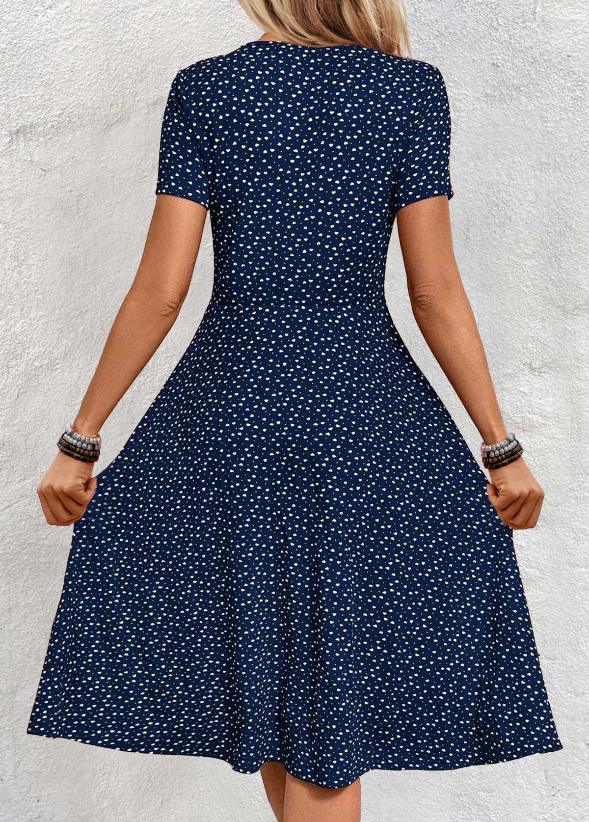 Navy Polka Dot Short Sleeve V Neck Dress