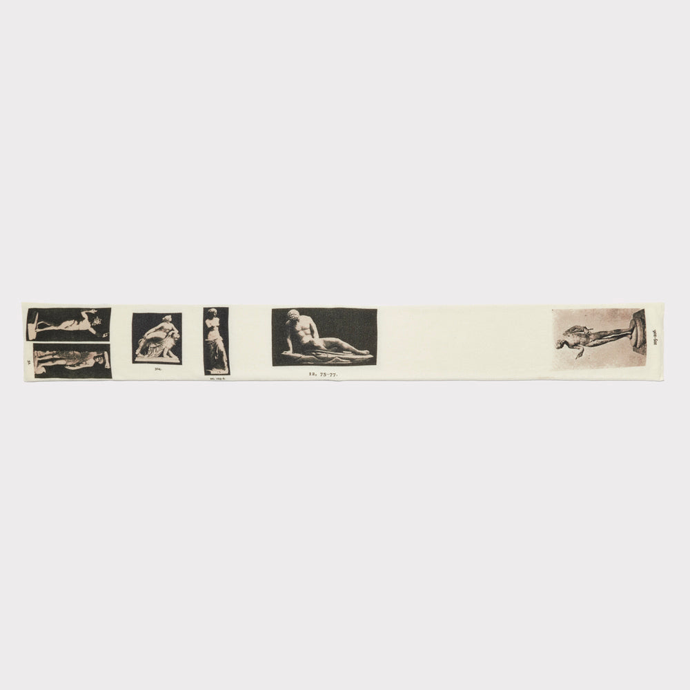 The ivory & blackNarcissus scarf. Handcrafted in Scotland the scarf is printed with the Greek mythology statues; Narcissus, Ariadne, Venus de Milo, the Dying Gaul, Hebe & wounded Amazonian.