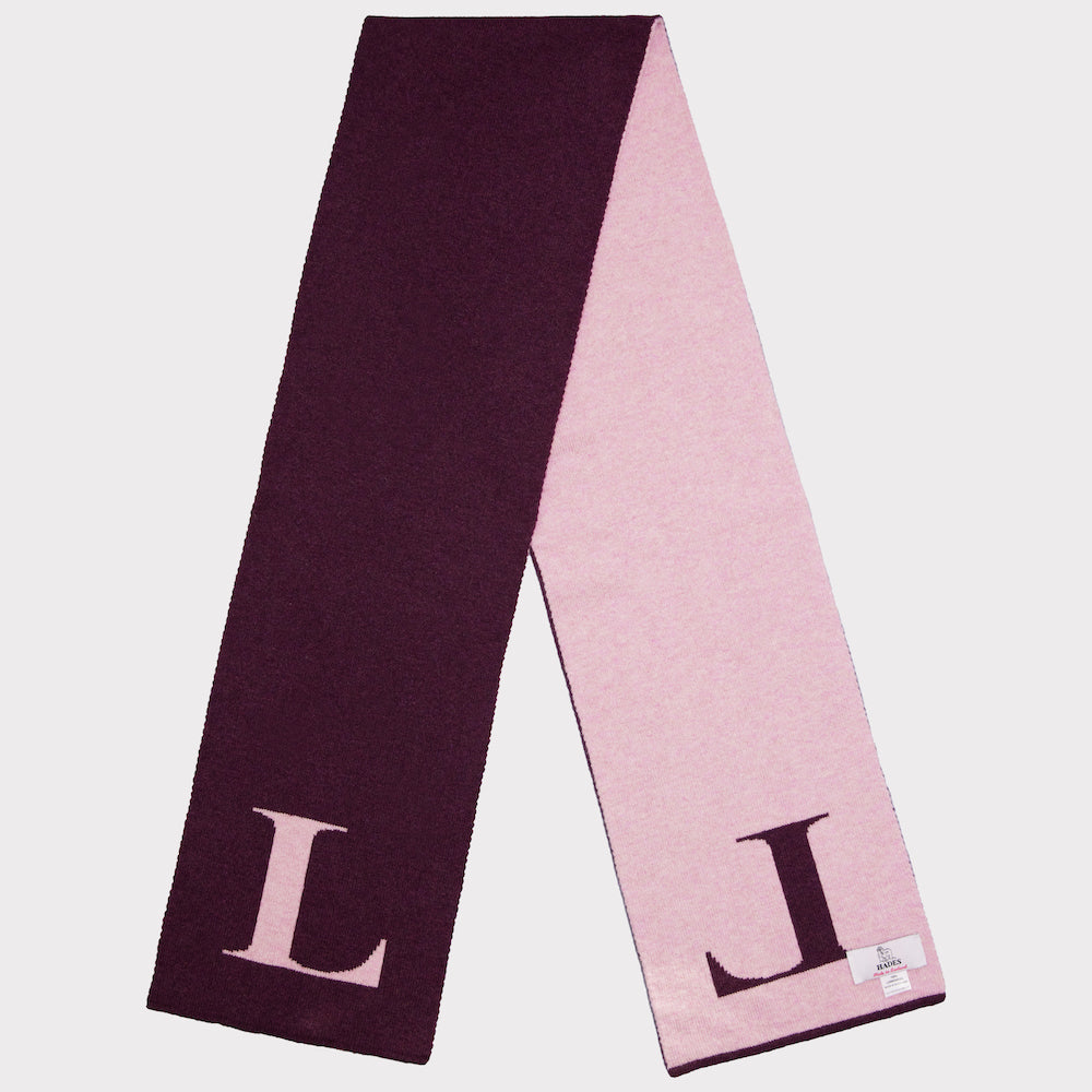 The grape & pink L macro double scarf from the Alphabet collection is made from pure lambswool.