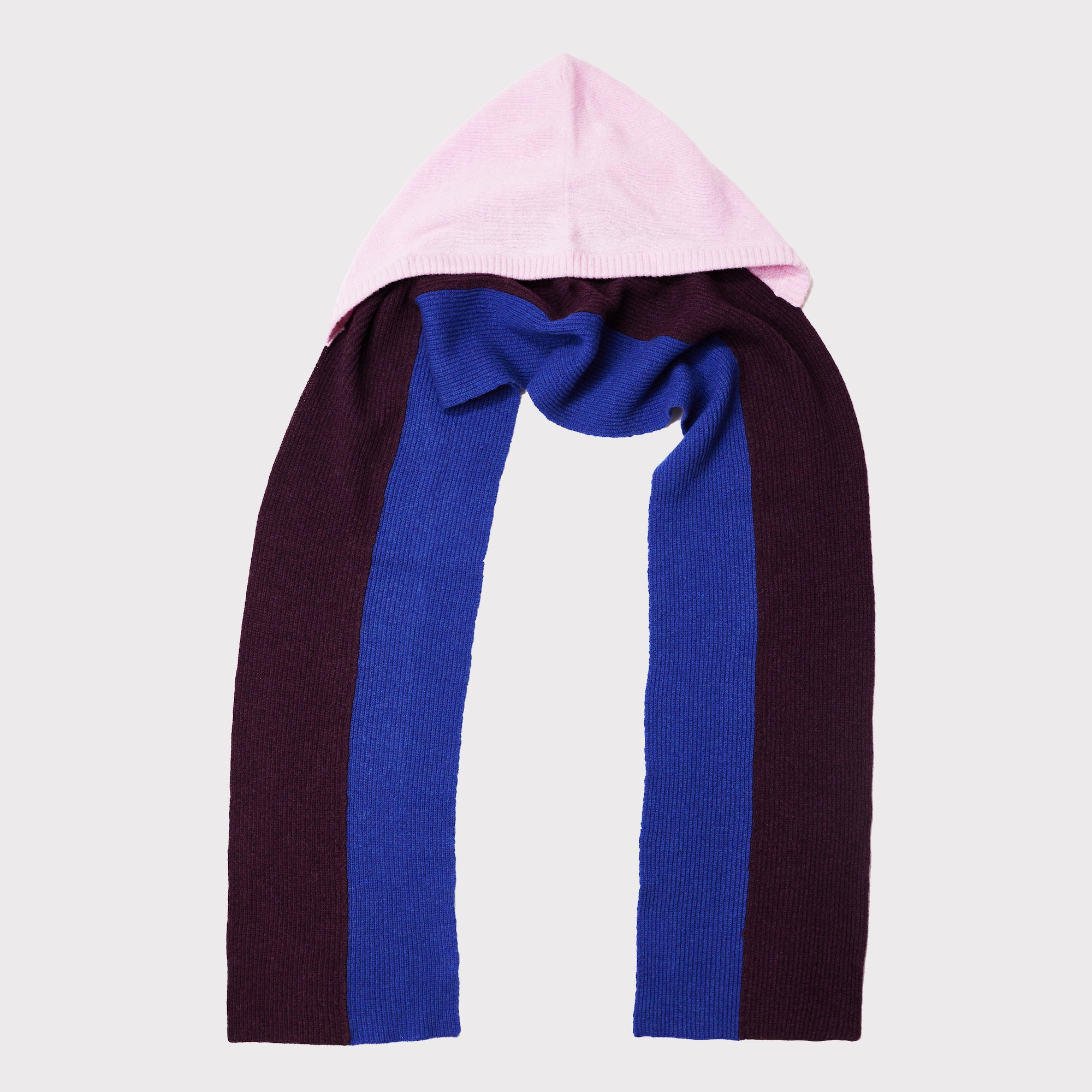 The pink hooded scarf is made from pure lambswool and is handcrafted in Scotland by Shirley, Shelia, Finlay & Sharon.
